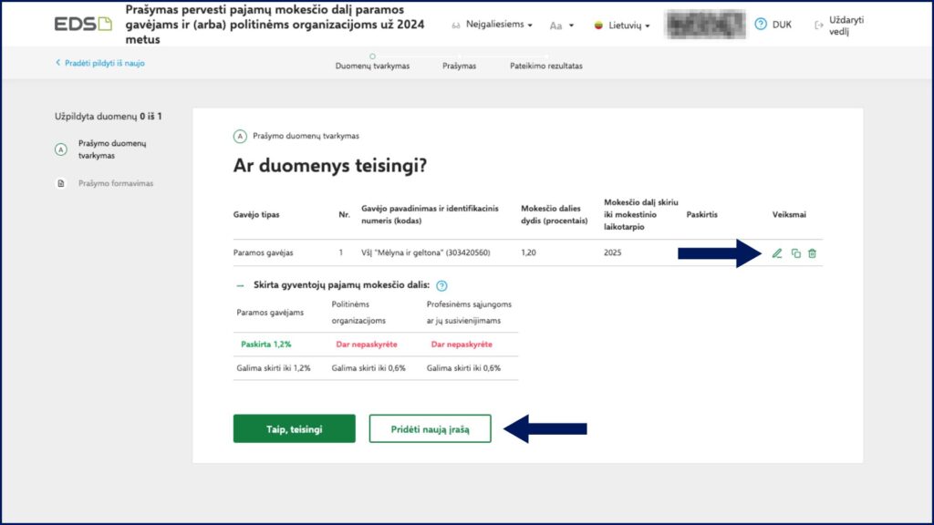 5. Jei parama už praėjusius mokestinius metus jau buvo paskirta pagal ankstesnių metų prašymą, atsidariusiame lange paspauskite Tęsti”. Šiuo atveju matysite esamus pasirinkimus ir galėsite juos koreguoti (pakeisti laikotarpį bei procentinį pasiskirstymą arba ištrinti buvusį pasirinkimą ir pridėti naują). Norėdami pridėti „Atsigręžk į vaikus“, rinkitės Pridėti naują įrašą” ir vadovaukitės 7-9 žingsniais.