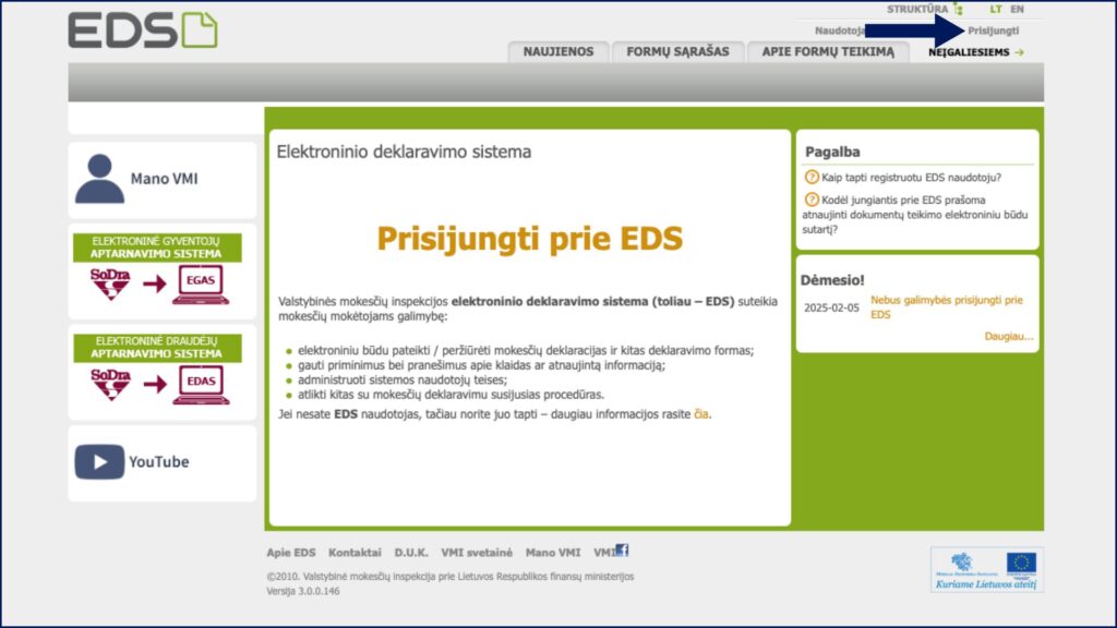 1. Prisijunkite prie VMI Elektroninio deklaravimo sistemos (EDS): https://deklaravimas.vmi.lt. Tą paprasčiausia padaryti naudojantis internetine bankininkyste arba elektroniniu parašu.