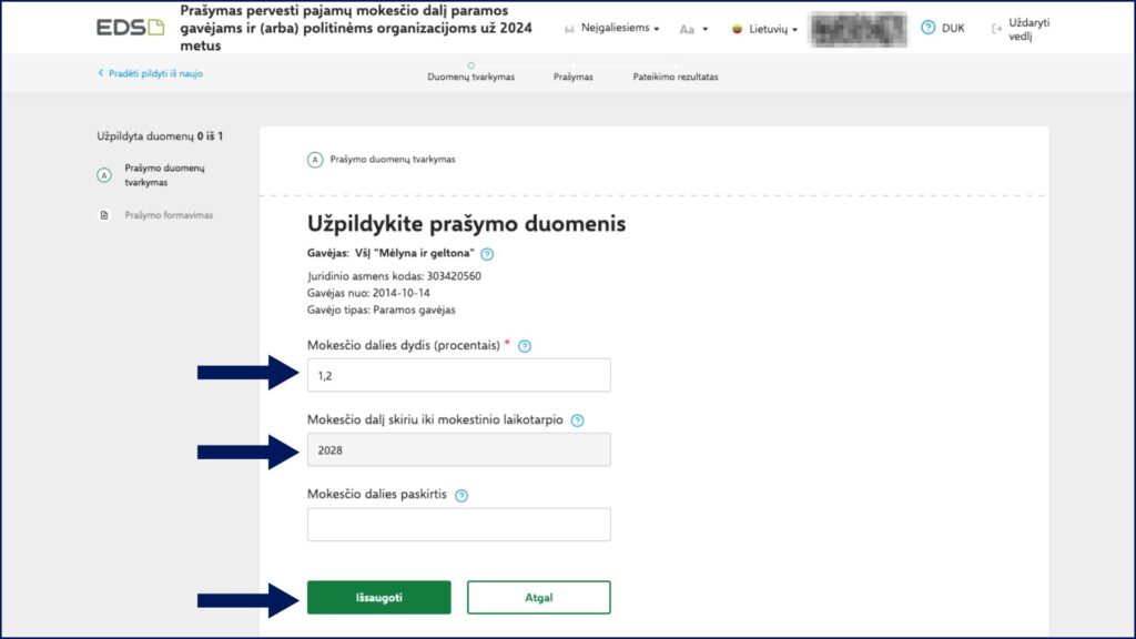 8. Atsidariusiame lange nurodykite, kokią mokesčio dalį norite skirti „Atsigręžk į vaikus“. Galite skirti visus 1,2 proc. arba, jei norite paramą skirti ir kitoms organizacijoms, nurodyti mažesnį procentą. Nurodykite, kokiam laikotarpiui skiriate paramą. Pajamų mokesčio dalį vienu prašymu galite skirti už 5 metus (pastaruosius praėjusius kalendorinius metus ir ateinančius 4 metus). Taigi jei pildote deklaraciją už 2025 m. ir norite paramą skirti 5 metus, laikotarpį pažymėkite iki 2029 m. Užpildę laukelius, išsaugokite pasirinkimus.