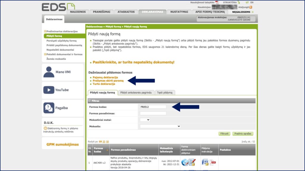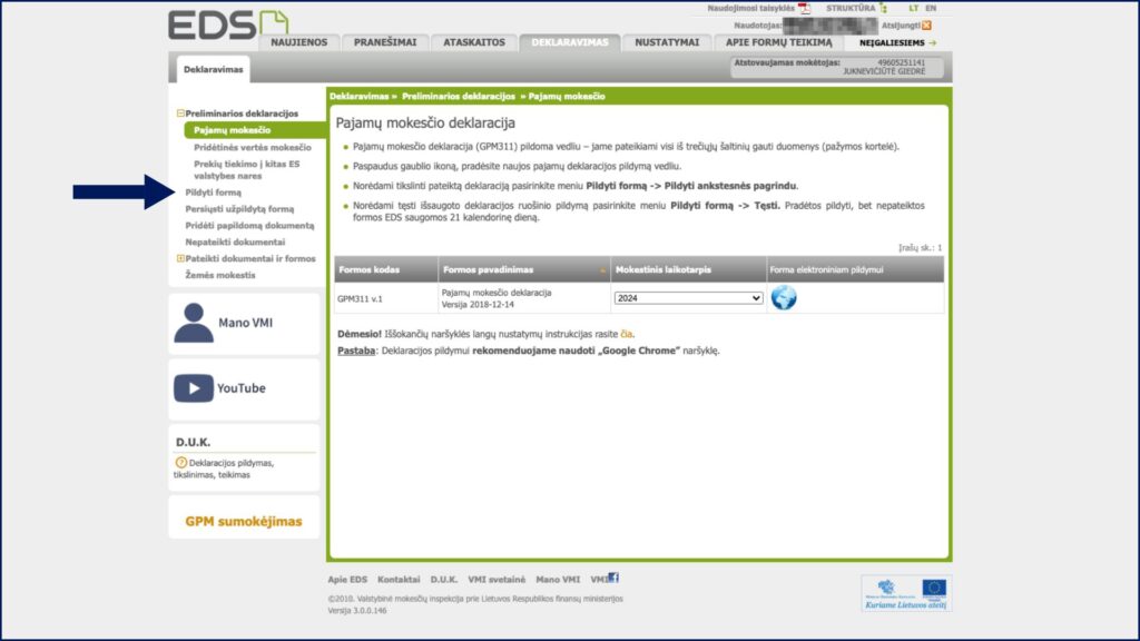2. Prisijungę prie EDS sistemos, sekcijoje „Deklaravimas“ pasirinkite „Pildyti formą“.