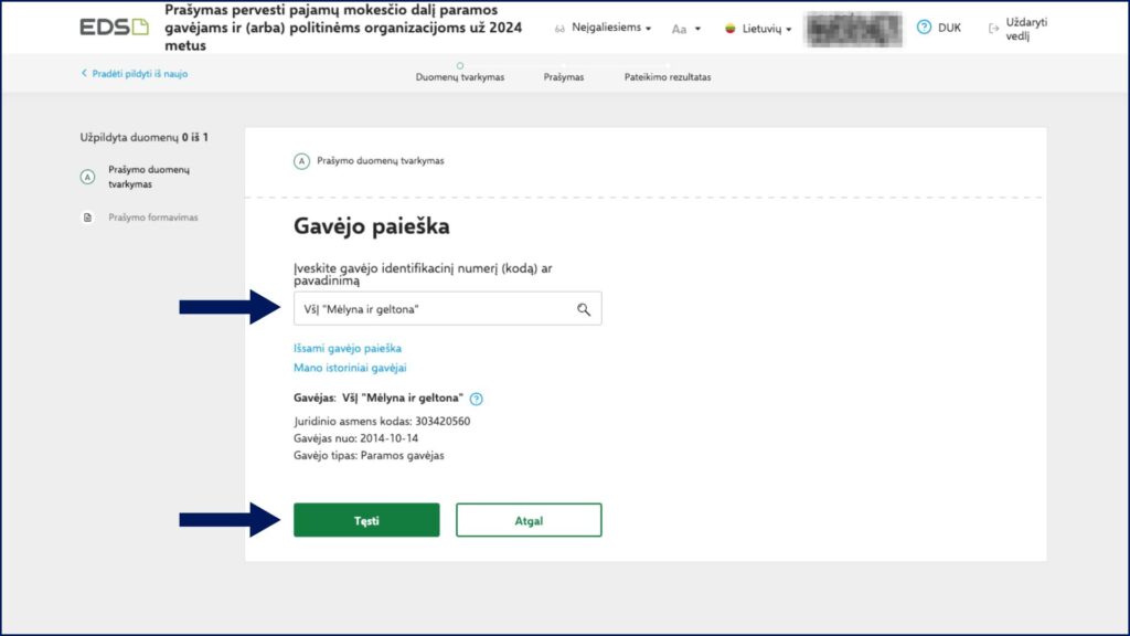 7. Gavėjo paieškos lauke įveskite pavadinimą „Atsigręžk į vaikus“ arba juridinio asmens kodą 124015620 ir pasirinkite gavėją VšĮ „Atsigręžk į vaikus” iš sąrašo. Tęskite formos pildymą.
